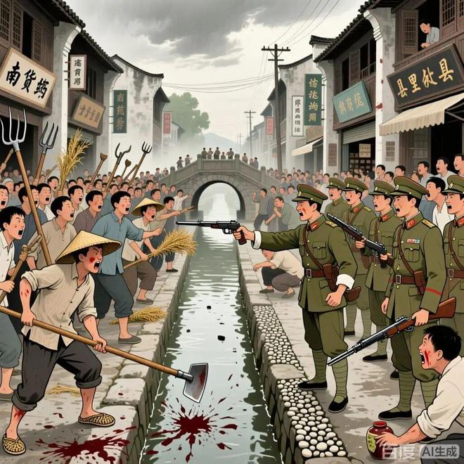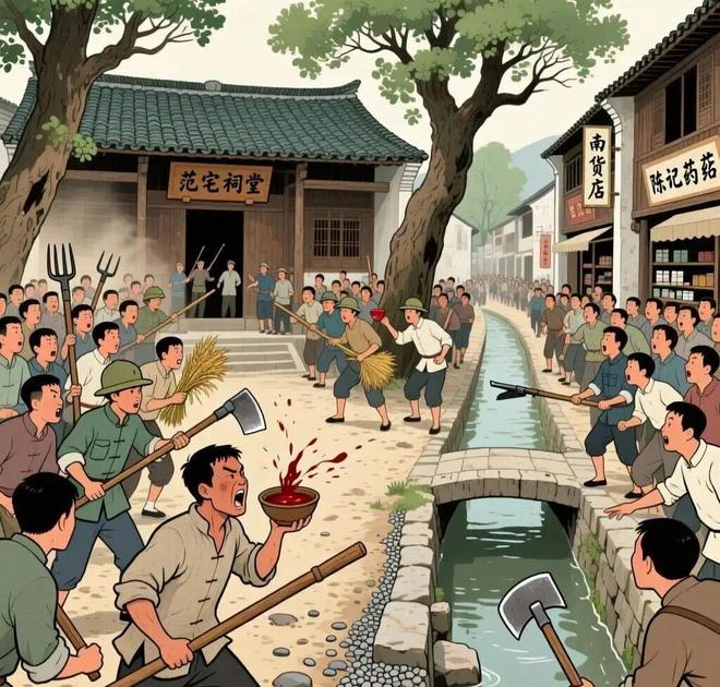 八月十六这一天,各村的青壮年拿着木棒、稻叉、锄头等“武器”,到比较集中的范宅祠堂集合,布置好行动步骤后,众人喝下掺着鸡血和香灰的老酒,向力洋进发。到达力洋最热闹的大桥头时,发现县里来的一个排官兵早已在那里守候。力洋大桥头是力洋大街的中心地段,是一个十字路口,街只有5-6米宽,旁边开满南货店、药铺等,一条2米宽的水甽自北向南穿桥而过,甽边有一条2米宽的石子路,要到乡长家里去,必须要经过此处。在这样一个地方,一下子来了几百个手持锄头草耙的人和20多名官兵,还有前来看热闹的人,挤在一起,可以说拥挤不堪。此时,官兵还在解释名册事情,但众村民根本不信,吆喝声、谩骂声此起彼伏,僵持一段时间后,一位领头村民借着喝过鸡血酒的酒劲,一把抓住排长的胸口,要求官兵让路。排长恼怒,拿枪指着村民,要其放手,村民不理,排长鸣枪警告,警告几次无效后,用枪将其击倒,这下现场大乱,村民群情激愤,一拥而上,混战在一起。官兵们的枪在人群中发挥不出应有的威力,反倒是村民的锄头草耙作用则更大。现场的人打的打,逃的逃,不少无辜的人都遭了殃。混战一阵后,双方皆有死伤,官兵方面只有排长等数人跑出。排长等逃出后,被西仓山里土匪获悉,他们便集结一批人到百丈路廊的山边设伏,当排长与手下逃到那里时,将其拦住,并用石板砸死。后来,该土匪集团被部队消灭。