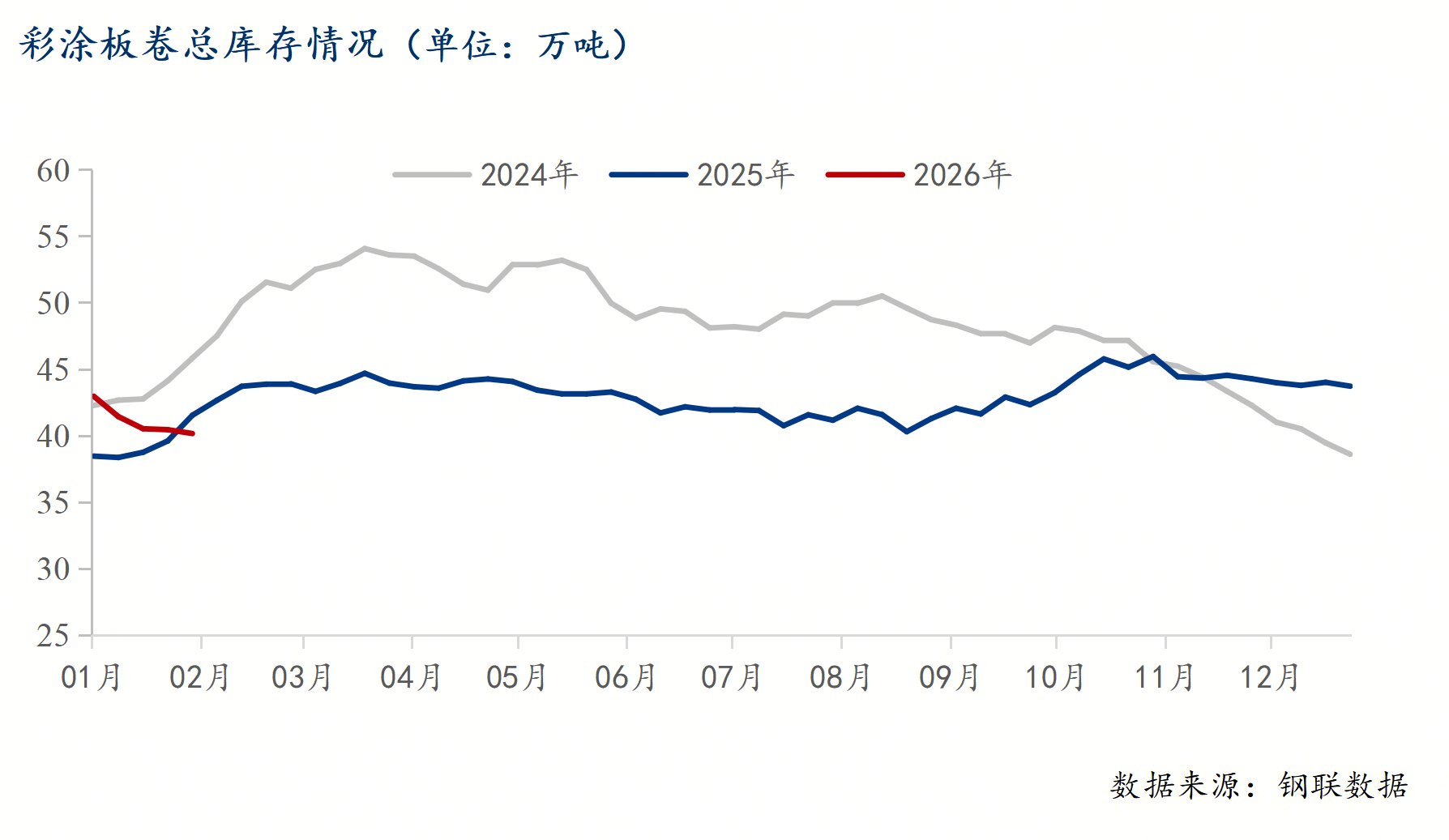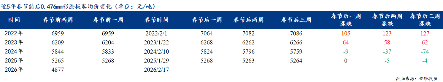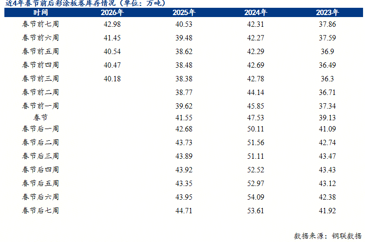 从库存的变化情况看,1月份彩涂板卷的消费环比12月表现尚可,连续4个星期小幅降库。截止2026年1月30日,彩涂板卷总库存40.18万吨,周环比减少0.29万吨,月环比减少2.8万吨,年同比减少1.37万吨,当前彩涂板卷总库存为三年来同期中位水平。但我们不能忽略的是,马上迎来春节假期,我们更应该关注的是农历同期的库存水平。从春节前后的库存对比看,当前彩涂板卷库存为近3年同期中位水平,高于2025年同期。而对于2月份市场行情,多数商家持谨慎偏悲观心态,主要是随着天气逐渐转冷,项目陆续停工,市场需求减少。