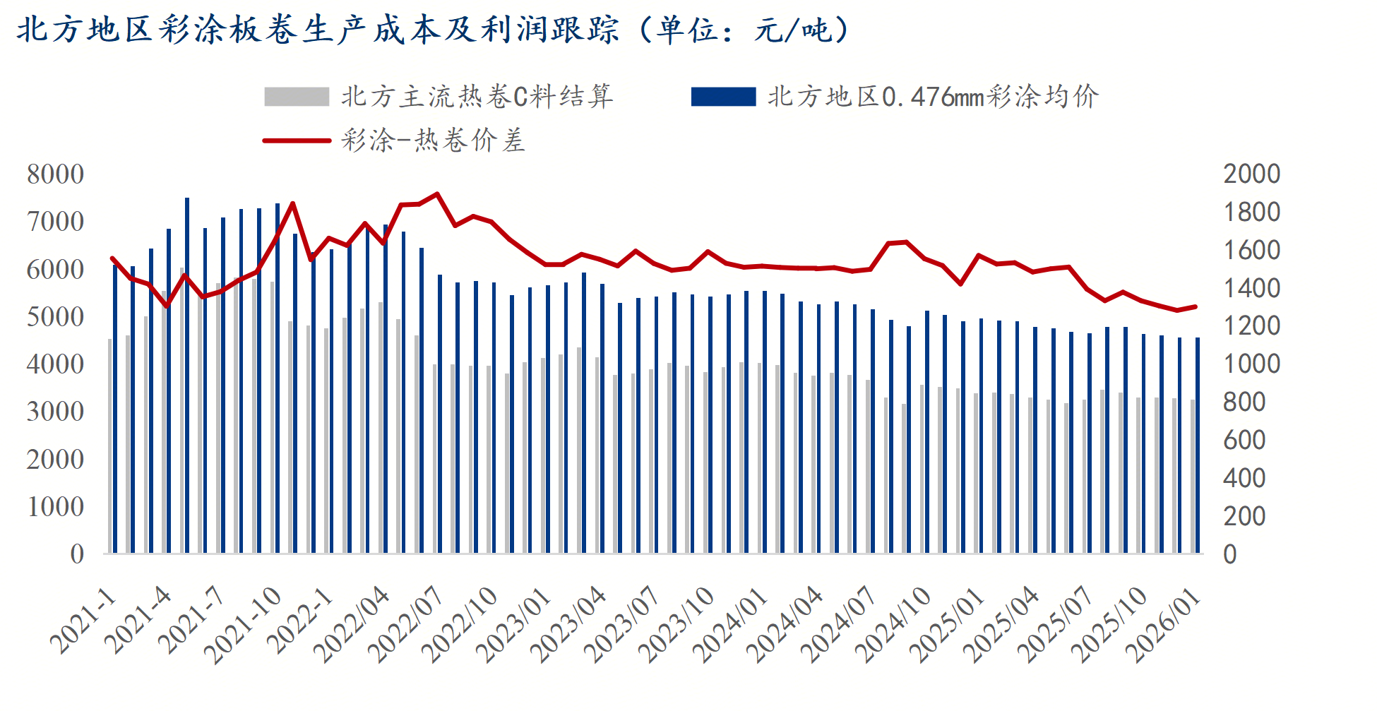 截止2月3日,唐山市场冷轧基料价格在3140-3170元/吨,北方地区民营彩涂主流钢厂销售价格在4250-4500元/吨。从价差来看,彩涂与原料热卷的价差在1300元/吨,部分钢厂销售价格与热卷价差也在1000元/吨及以下。1月彩涂板卷因工程项目陆续收尾、假期临近原因,需求逐渐减少。原料热卷情况看,当前北方热卷生产企业也并无盈利,因此短期热卷下跌的空间相对有限,成本端依旧有支撑。