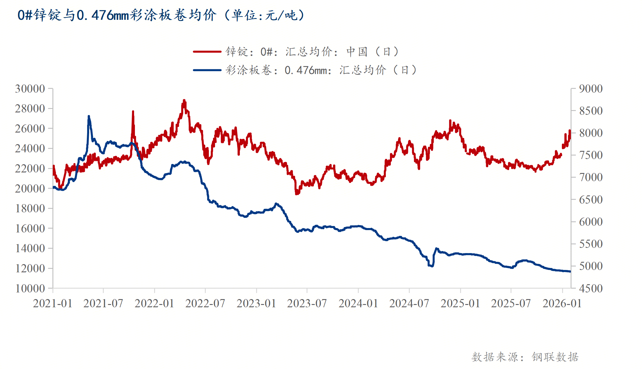 1月份锌锭价格小幅上涨为主,截止1月30日,0#锌锭价格25803元/吨,月环比上涨2455元/吨。1月份均价24609元/吨,较12月份均价23161元/吨上涨1448元/吨,涨幅6.25%。锌锭价格上调,彩涂板卷成本端压力也在进一步加大。