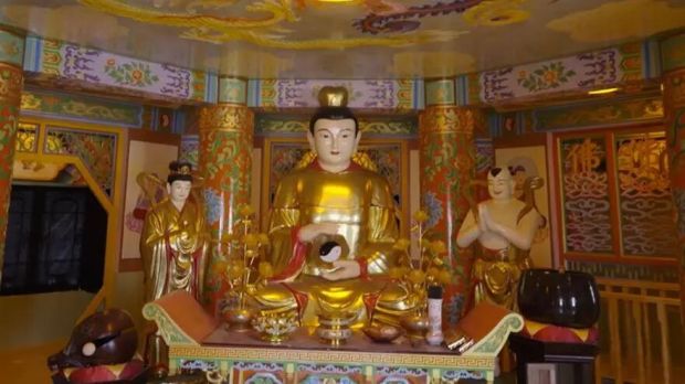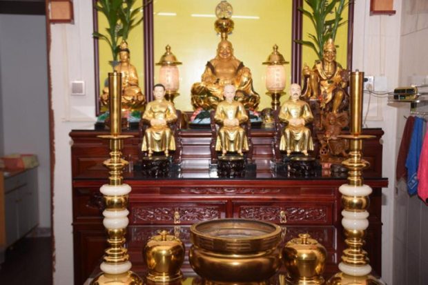 ▲“弥勒大道”与“一贯道”信奉的“弥勒佛”实为其第十七代“祖师”路中一的化身,最中间供奉的牌位为“金公祖师”路中一