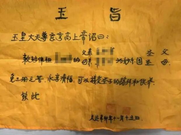▲警方从“古佛组织”中搜出的所谓“玉旨”,从“玉皇大帝”“佛祖”“圣父”“圣母”“圣子”等称呼可看出该组织是如何欺骗、迷惑群众的
